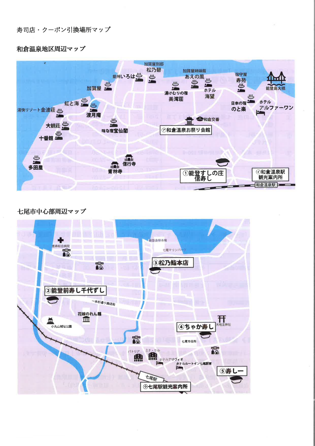 ※和倉温泉地区ご宿泊コースのお客様には「能登前寿しクーポン」、輪島地区ご宿泊コースのお客様には「能登丼チケット」を付与いたします。