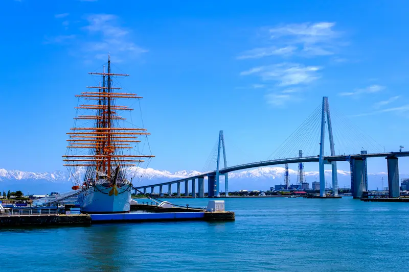 こちらは海王丸パークの隣にそびえる日本海側最大級の斜張橋「新湊大橋」。白い帆船と真っ白な橋の組み合わせは写真映え抜群で、晴れた日には立山連峰とのコラボも楽しめます。