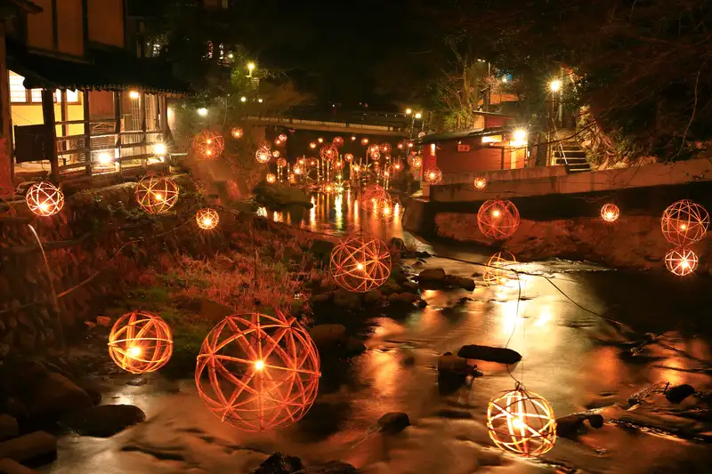 黒川温泉は、風情ある石畳の温泉街と露天風呂巡りが魅力の温泉地です。秋には「例年10月下旬~11月中旬」に紅葉がピークを迎え、温泉街と山々が鮮やかに色づきます。例年12月から3月にかけ、球体状の「鞠灯籠」や筒状の「筒灯籠」を川面に設置してライトアップする「湯あかり」が開催され、雪景色と湯けむりの美しいコントラストも楽しめます。